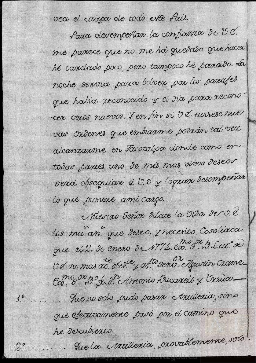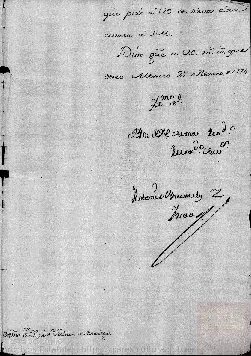 Dios guarde a V.E. m. a. que deseo. Mexico 27 de Henero de 1774.