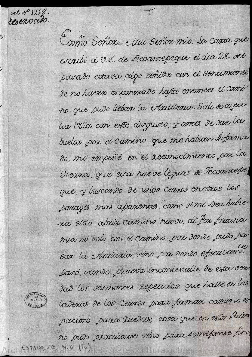 Mui Señor mio: La carta que escribí a V.E. de Tecoantepeque el día 28 de pasado estava teñida con el sentimiento de no haver encontrado hasta entonces el camino que pudo llebar la Artillería. Salí de aquella Villa con este disgusto, y antes de dar la buelta por el camino que me habían informado, me empeñé en el reconocimiento por la Sierra, que está a nueve leguas de Tecoantepeque, y buscando de unos cerros en otros los parages mas aparentes, como si mi idea hubiera sido abrir camino nuevo, di por fortuna mia no solo con el camino por donde pudo pasar la Artillería, sino por donde efectivamente pasó, siendo prueba incontestable de esta verdad los desmontes repetidos que hallé en las laderas de los cerros para formar camino espacioso para ruedas, cosa que en estos paises no pudo practicarse sino para semejante fin: pues en el Camino Real, por no dar los Yndios quetro golpès de hazada, van los Pasageros al pasar la Sierra con peligro de despeñarse como sucedió con una de mis cargas, y ha sucedido a otros muchos, especialmente quando hay Nortes.