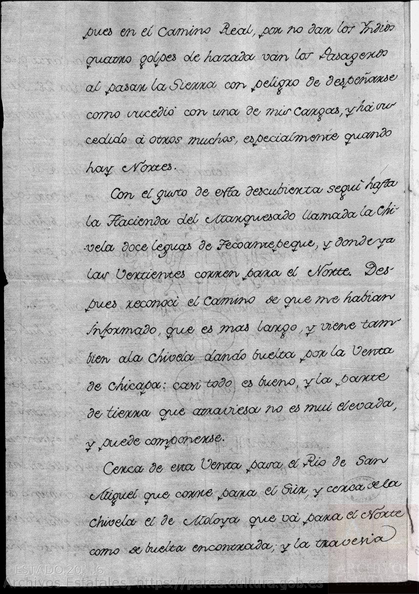 Con el gusto de esta descubierta seguí hasta la Hacienda del Marquesado llamada la Chivela, doce leguas de Tecoantepeque, y donde ya las Vertientes corren para el Norte. Después reconocí el camino de que me habían informado, que es más largo, y viene tambien a la Chivela dando buelta por la Venta de Chicapa: casi todo es bueno, y la parte de tierra que atraviesa no es mui elevada, y puede componerse.