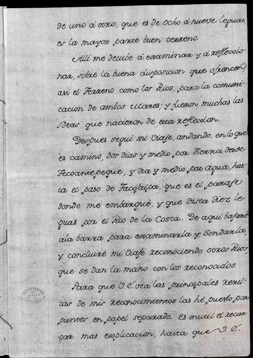 Despues seguí mi viaje andando, en lo que es camino, dos días y medio, por Tierra desde Tecoantepeque, y dia y medio por agua hasta el paso de Tacotalpa, que es el paraje donde me embarqué y que dista diez leguas por el Rio de la Costa. De aquí bajaré a la barra para examinarla y sondarla, y concluiré mi viaje reconociendo otros Rios, que se dan la mano con los reconocidos.