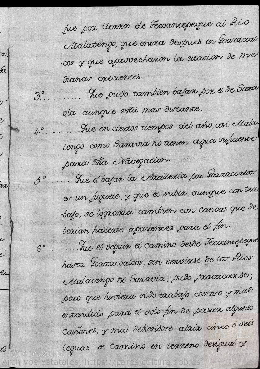 6º.- Que el seguir el camino desde Tecoantepeque hasta Goazacoalcos, sin servirse de los Rios Matalengo y Saravia, pudo practicarse; pero que huviera sido trabajo costoso y mal entendido para el solo fin de pasar algunos cañones, y mas debiendose abrir camino cinco o seis leguas de camino en terreno desigual y bosque mui fragoso.