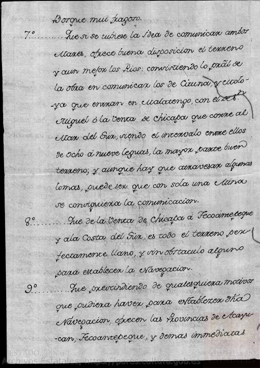 7º.- Que si tubiese la idea de comunicar ambos Mares, ofrece buena disposición el terreno y aun mejor los Rios: consistiendo lo principal de la obra en comunicar los de Cituna, y Moloya que entran en Malatengo con el de San Miguel o la Venta de Chicapa que corre al Mar del Sur, siendo el intervalo entre ellos de ocho a nueve leguas, la mayor parte buen terreno; y aunque hay que atravesar algunas lomas, puede ser que con una sola mina se conseguiera la comunicación.