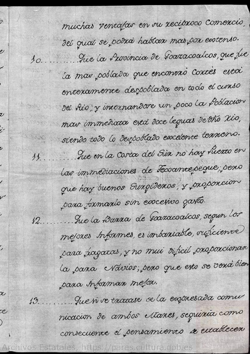10º.- Que la Provincia de Goazacoalcos, que fue la más poblada que encontró Cortés, está enteramente despoblada en todo el curso del Rio, y internandose un poco la Poblacion mas inmediata está doce leguas de otro rio, siendo todo lo despoblado excelente terreno.