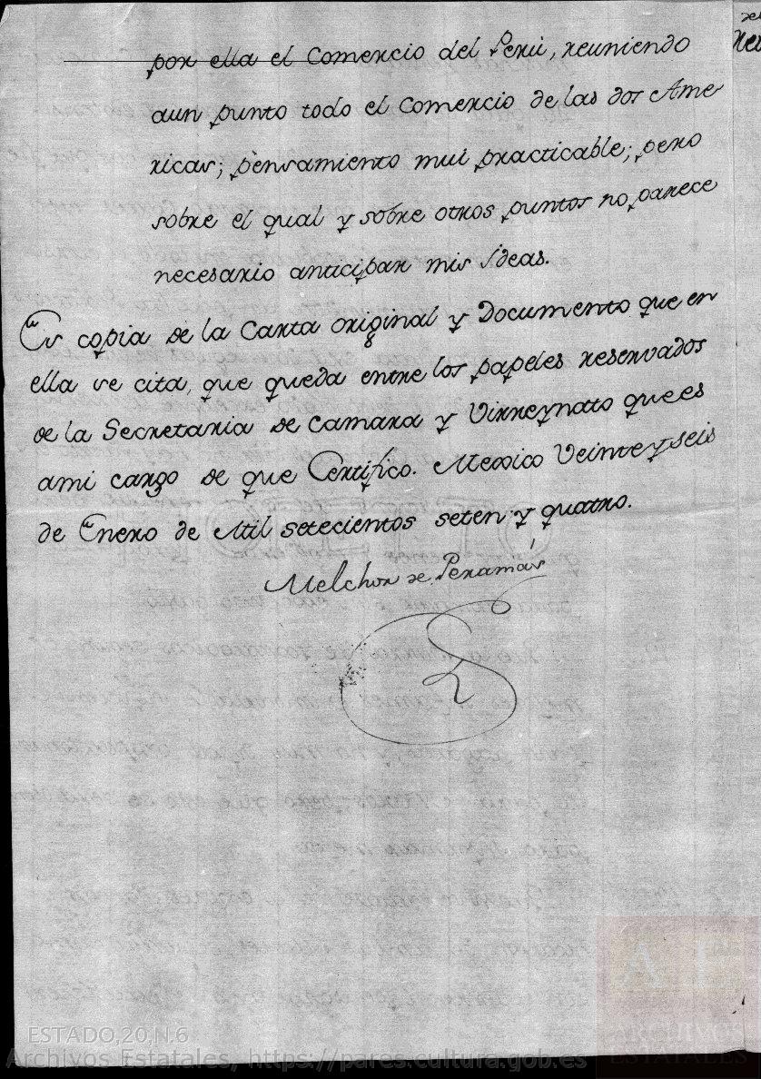 Es copia de la Carta original y Documento que en ella se cita, que queda entre los papeles reservados de la Secretaría de Cámara y Virreynato que es a mi cargo de que Certifico.