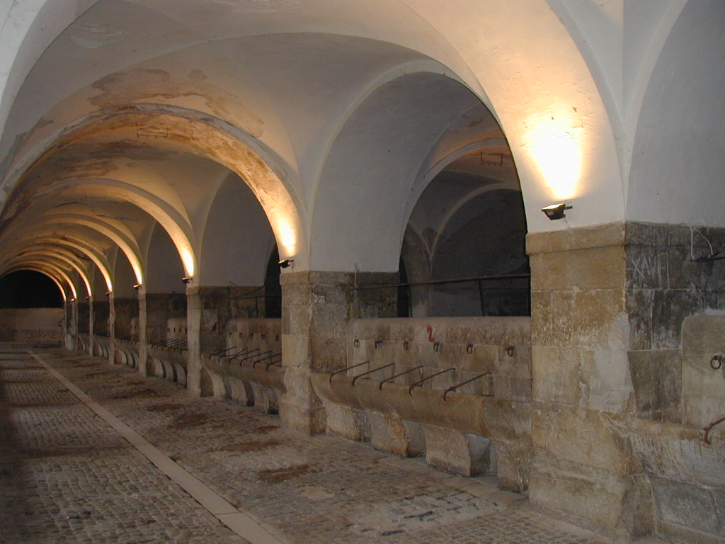 Al nivel del foso y adosadas a las cortinas entre los baluartes de San Narciso, gola de Santa Tecla y Santiago por su parte inferior, se encuentran las caballerizas. LLaman la atención por su gran amplitud, comodidad y su buena ventilación. Su bóveda es magnífica. El piso de piedras, las cuales tienen forma de cuña, son iguales y están perfectamente encajadas, tiene una cuneta en el centro para dar salida a las aguas sucias. Los pesebres son de piedra con anillas de hierro. En la contraescarpa al nivel del foso hay abrevaderos, de forma análoga e igual material a la de los pesebres interiores.