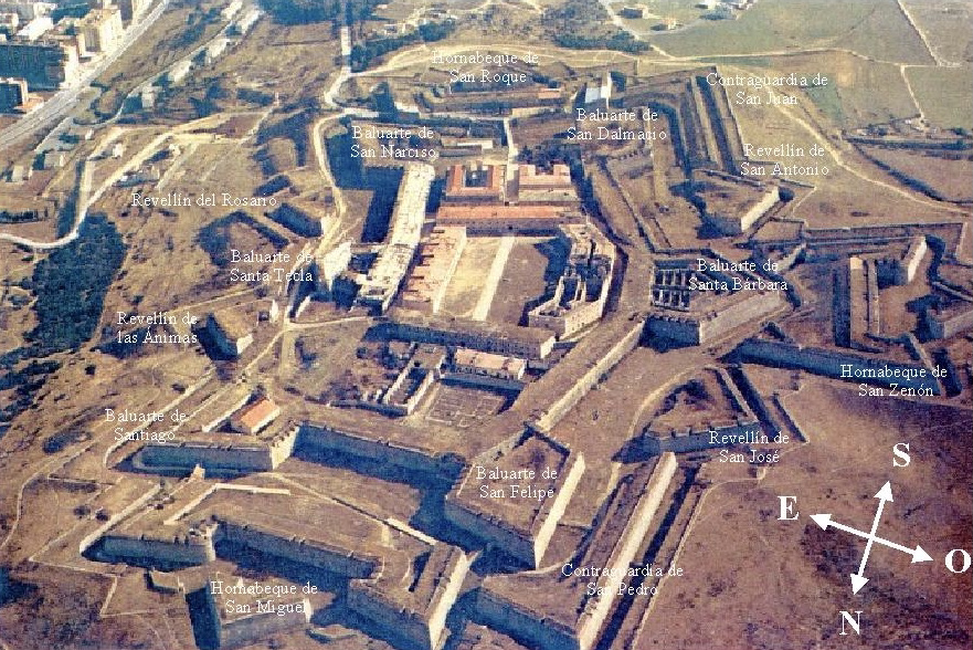 En la fotografía de arriba puede observarse el baluarte de San Narciso, fotografiado desde la terraza del baluarte de Santa Tecla. Obsérvese la altura del foso, 13 metros. A la izquierda se encuentra el revellín del Rosario. La cortina de la derecha tiene 117 metros de longitud.