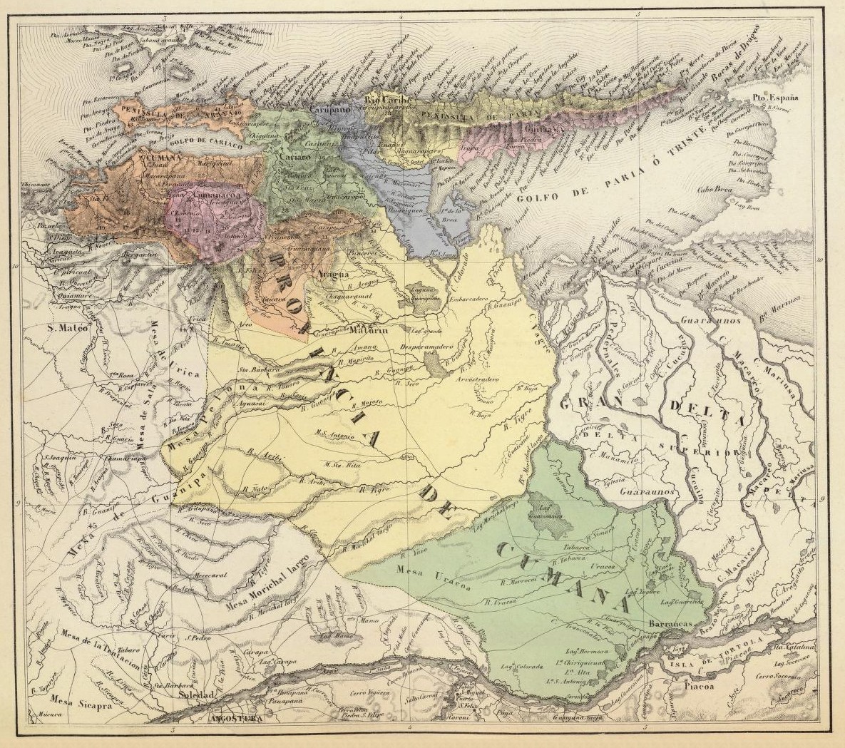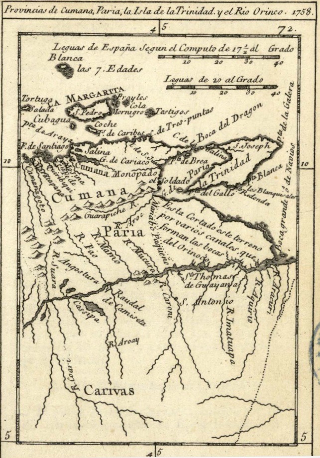 En el Atlas Geográfico de la América Septentrional y Meridional, publicado en París por Thomás López, pensionista de S.M. el Rey Fernando VI en 1758, la provincia de Cumaná se describe en las páginas 71 y 72 de la siguiente forma: