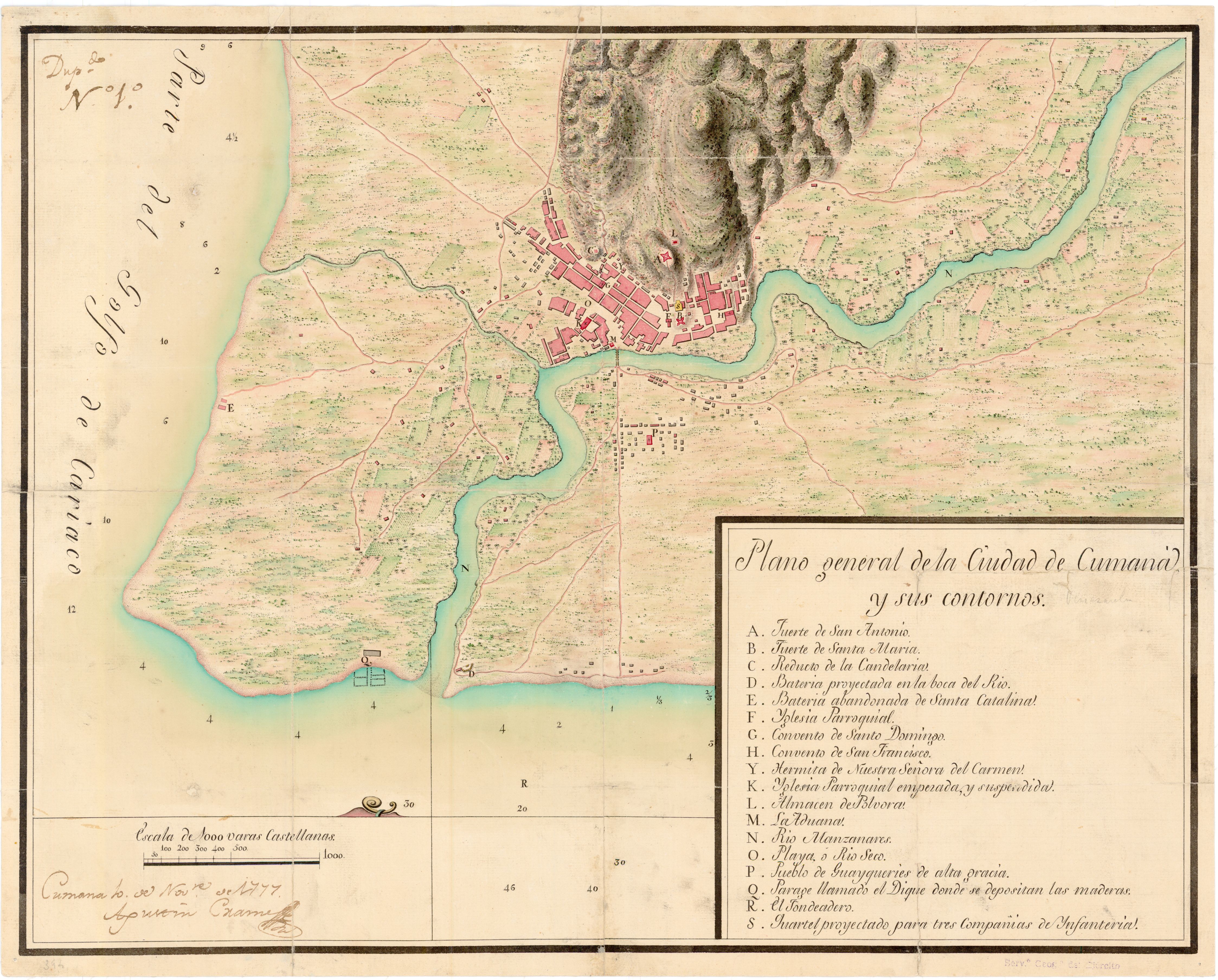 "CUMANA es la Ciudad Capital de esta Provincia, situada en la tierra firme, a dos leguas de la Mar entre un bosque espeso: tiene esta Ciudad una Rada sobre el Mar mui comoda en una Bahia bien limpia, sin peñasco alguno, con 14 brazas de profundidad: no está mui poblada; sus habitantes son dóciles, los que habitan en las costas; pero los de tierra adentro mui feroces.