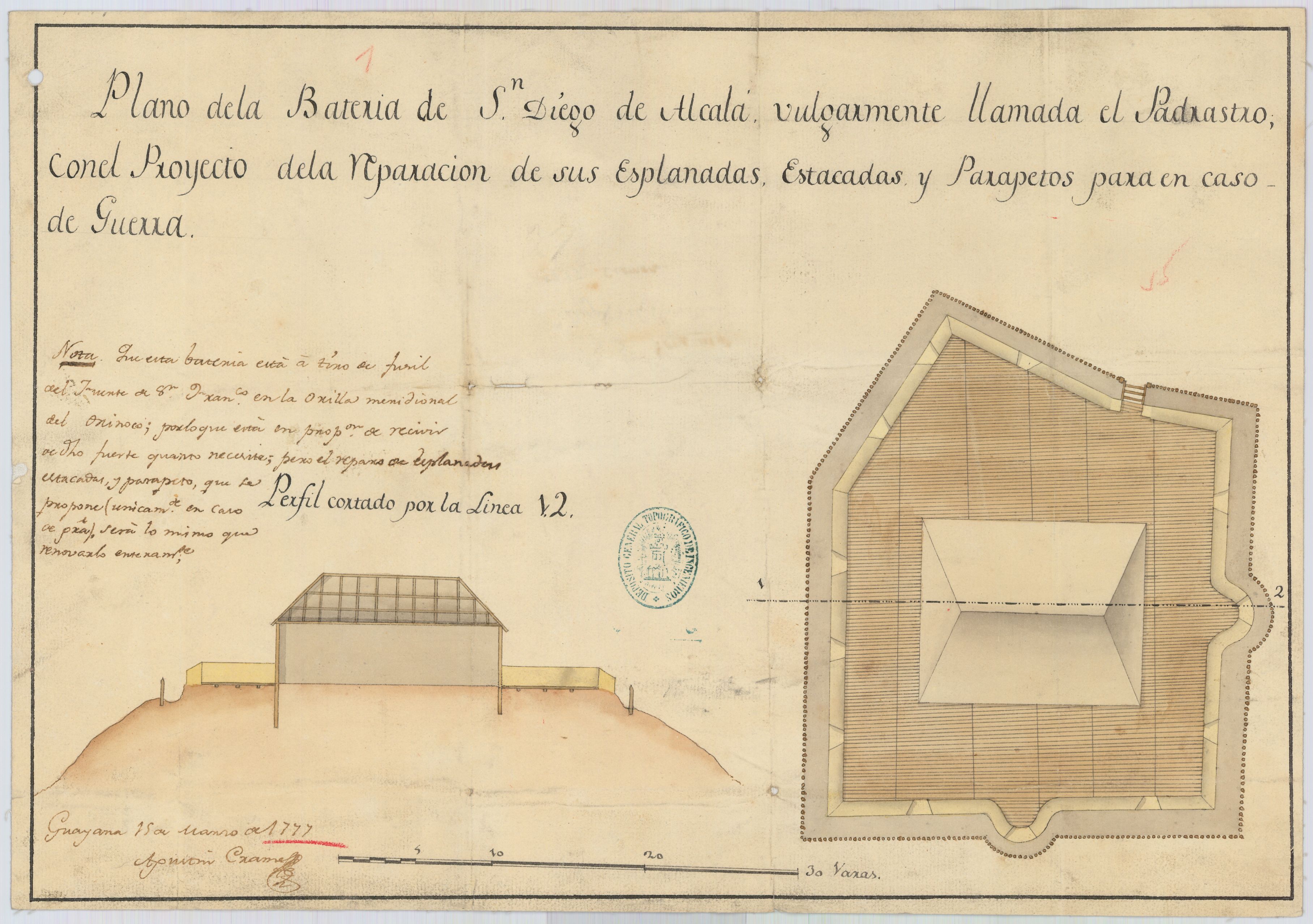 14º.- A más de 300 varas de San Francisco está un cerro muy dominante sobre él, y éste es otro gravísimo defecto. En dicho cerro, que vulgarmente llaman el Padrastro está construida la batería de San Diego que tiene 11 cañones con lo demás que expresa la relación número 2, pero cuyas explanadas están enteramente podridas, y lo mismo la estacada que sobre cimientos de mampostería circunda a dicha batería.