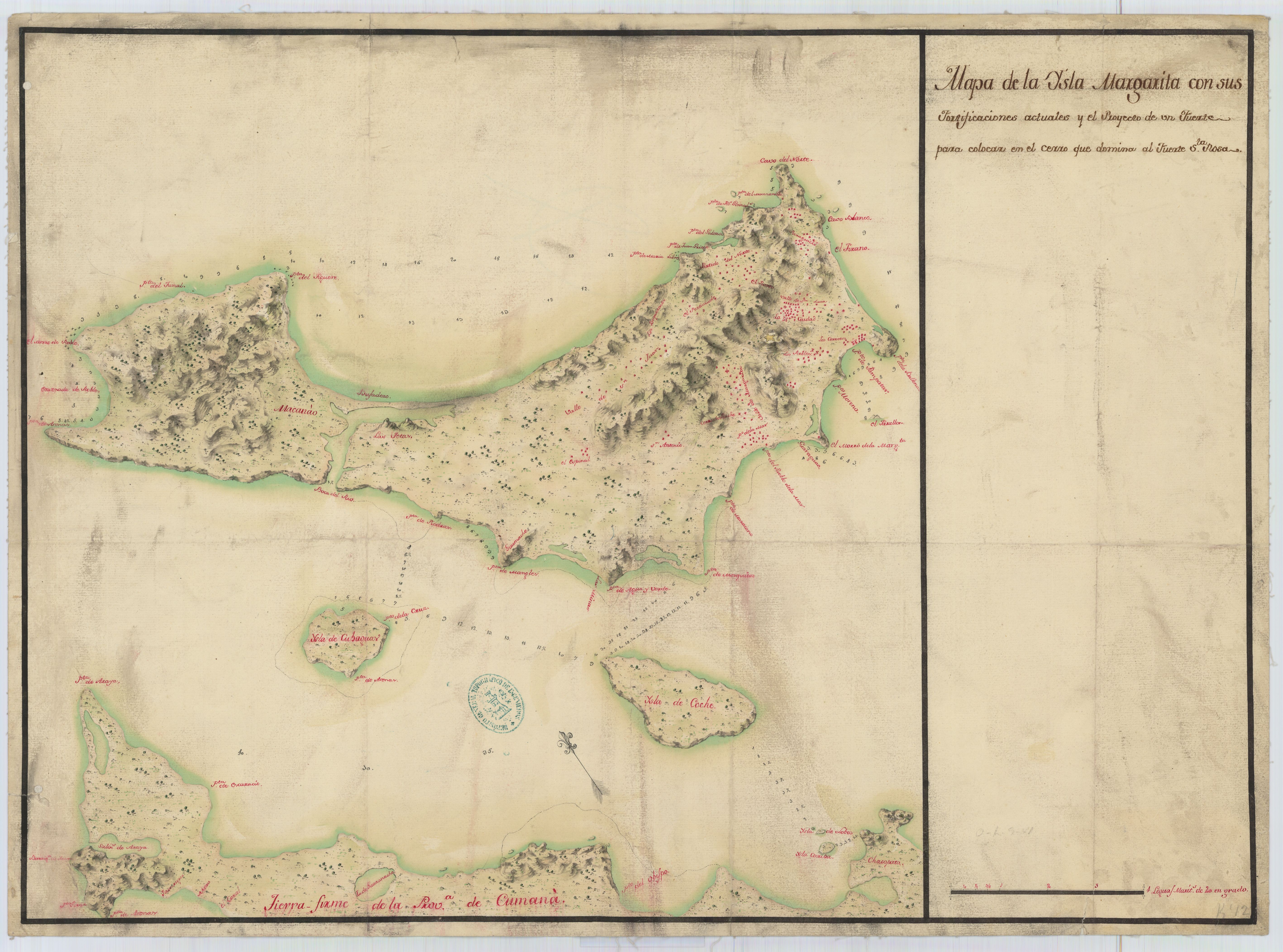 9º … Por todas partes exceptuando las del Este, es accesible esta Isla: pero los parajes de mayor recelo son el Puerto de Pampatar en el Sud y el de la Galera en el Norte; y como las precauciones que se tomen en el uno, pueden aplicarse para el otro, y el primero es el principal, se establecerá el plan de Defensa con consideración a que será aquel el paraje por donde intenten los Enemigos invadir esta Isla.