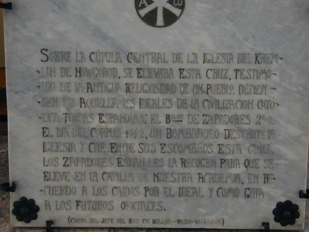 La cruz de Nodgorod fue recogida por los zapadores españoles después de ser destruida por los soviéticos. Ellos la reconstruyeron y guardaron en su batallón como un símbolo de su religiosidad. Su deseo fué conservarla, y para ello eligieron como lugar de destino la capilla de la Academia del Arma de Ingenieros.