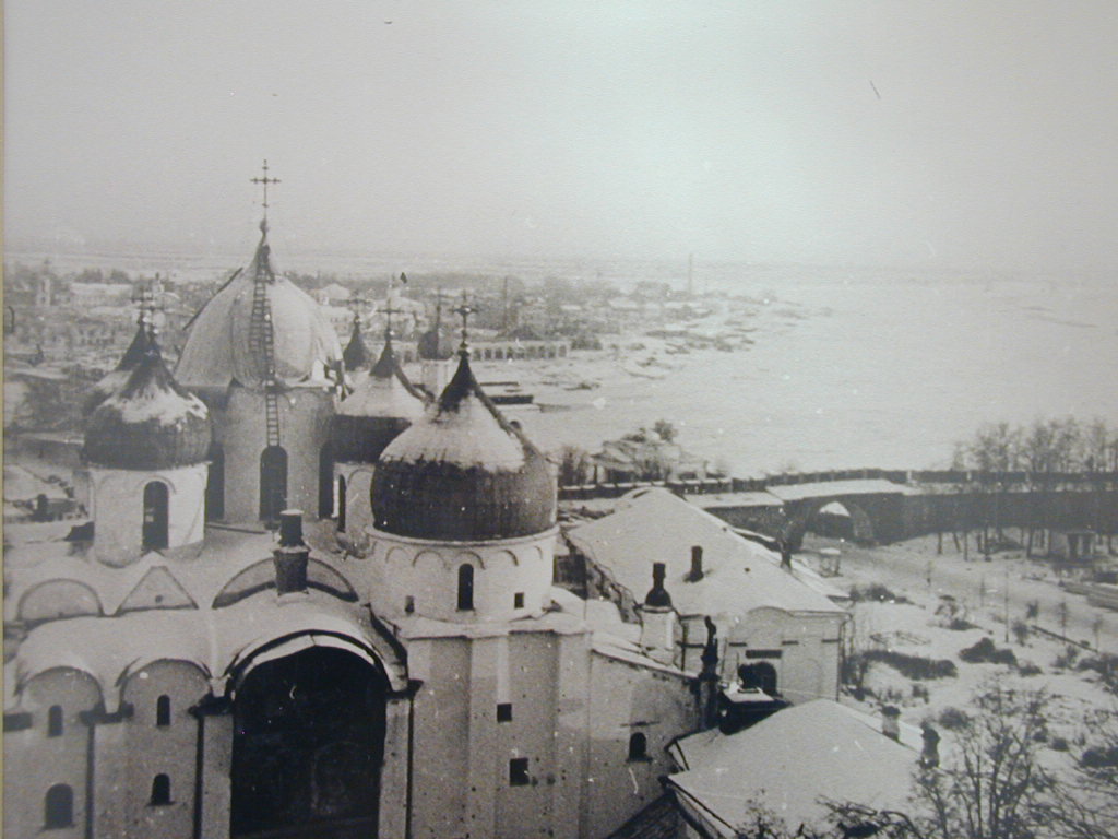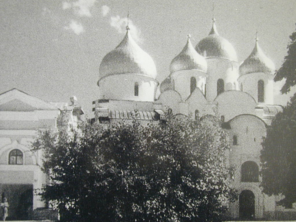 La existencia de la iglesia catedral de Santa Sofía de Novgorod data del siglo XI, y fue consagrada en septiembre del año 1052. Desde entonces había pasado por diversas destrucciones y saqueos, muy ligados a la historia de su país. Fue utilizada como puesto de mando en varias invasiones, museo en tiempos de paz y totalmente reconstruida en 1899, de cuya fecha databan las cruces que coronaban las cúpulas. Antes de la Segunda Guerra Mundial era utilizada como museo por las autoridades soviéticas.