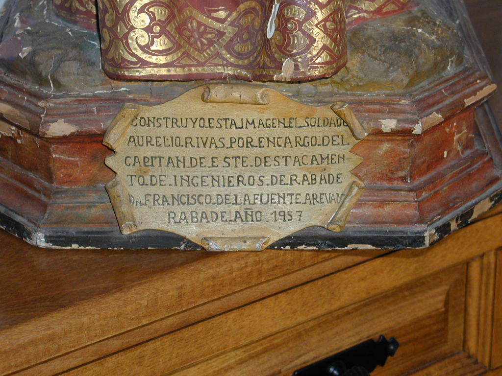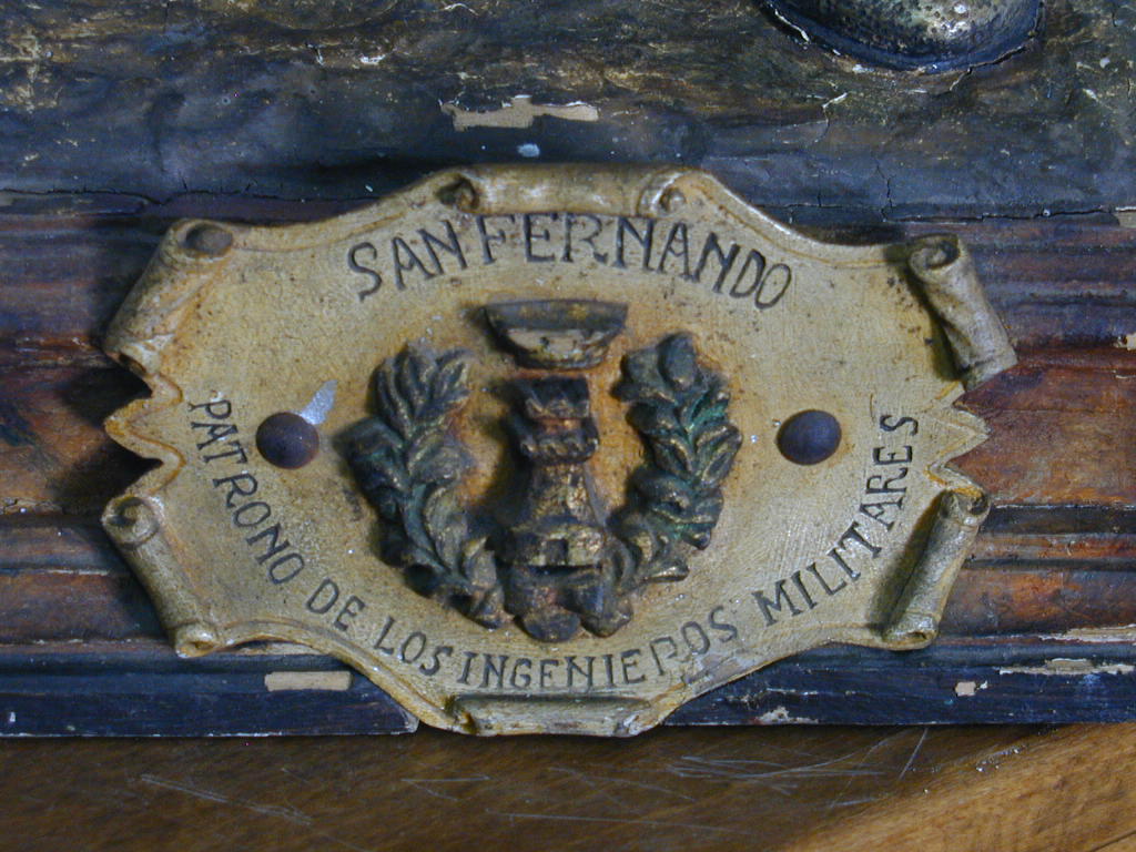 Talla de San Fernando realizada en 1957 por el soldado Aurelio Rivas por encargo del capitán de Ingenieros don Francisco de la Fuente Arévalo, jefe del destacamento de Ingenieros de Rabade. Se expone en la Sala de Juntas de la Jefatura de Apoyo y Servicios (JAS) de la ACING.