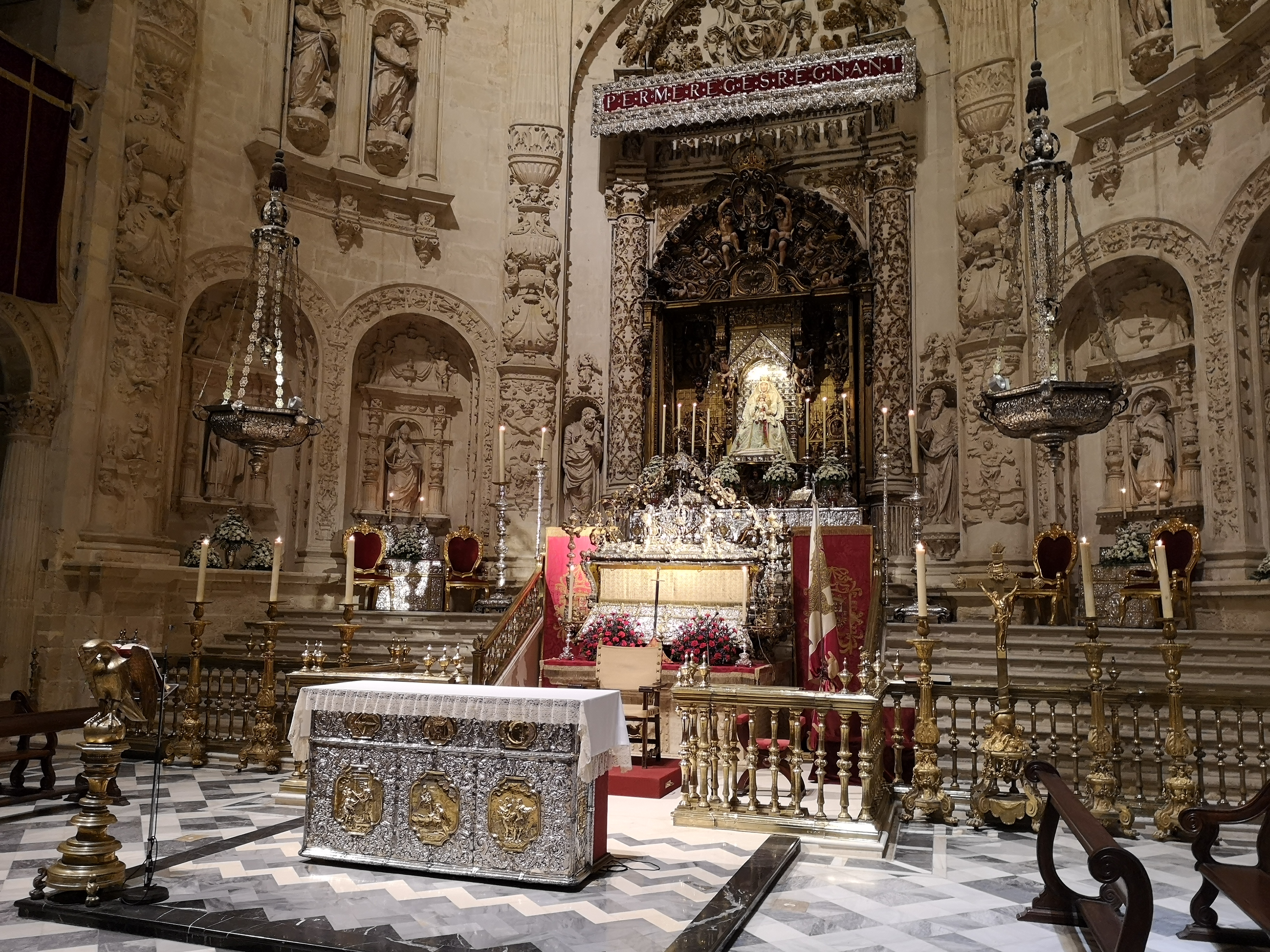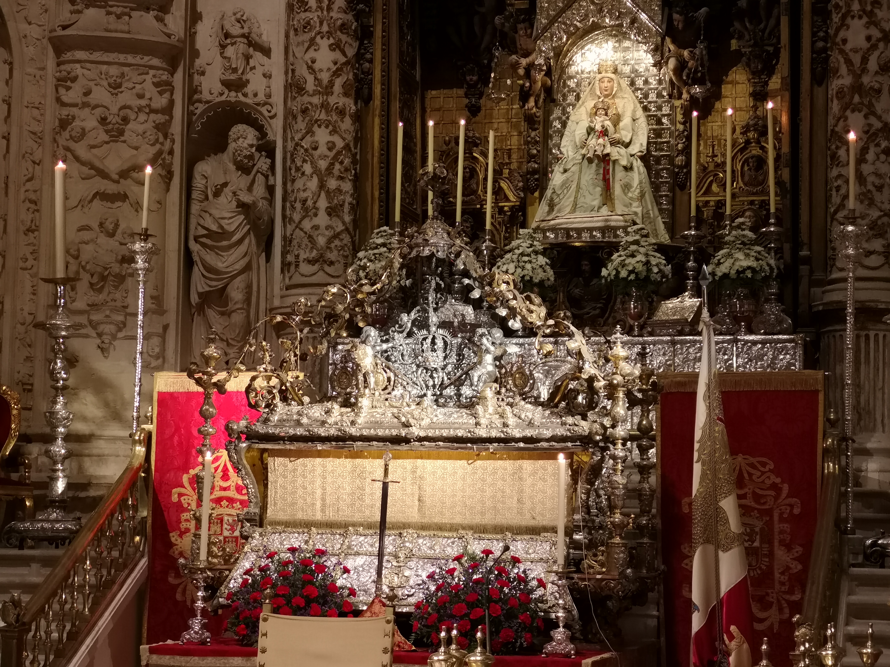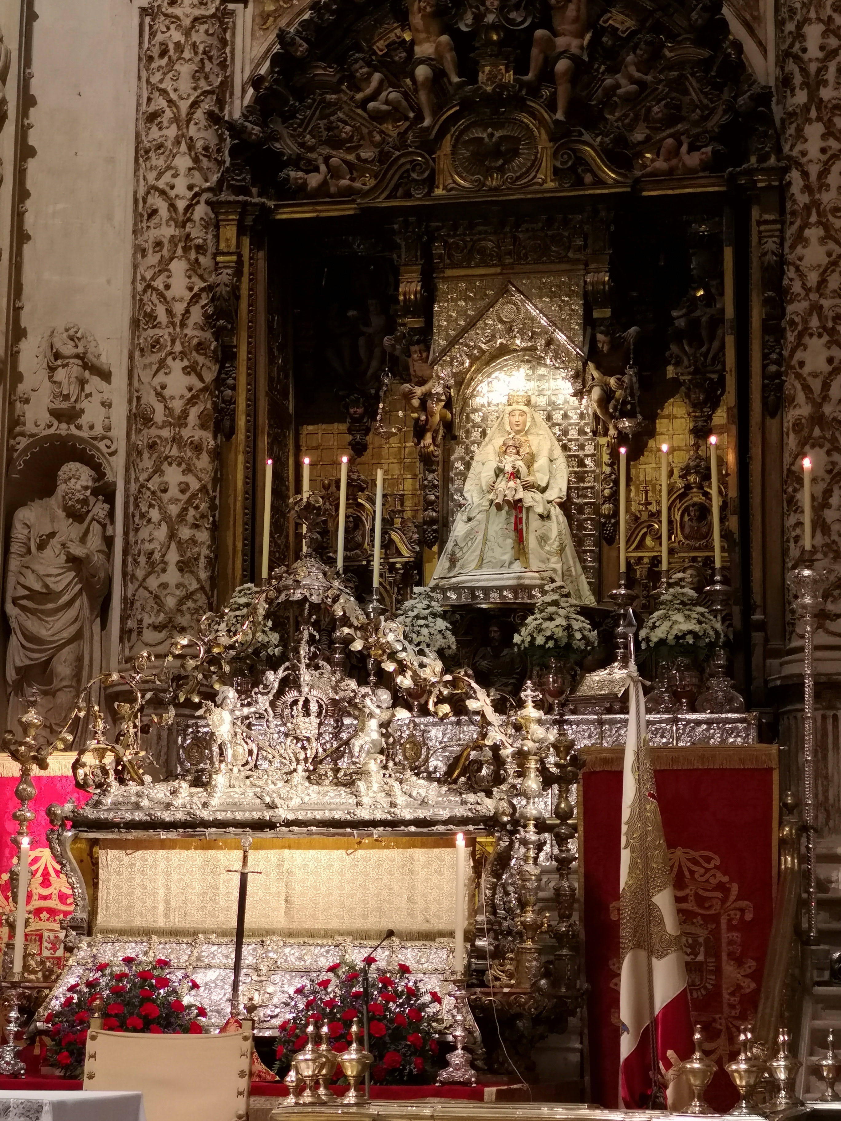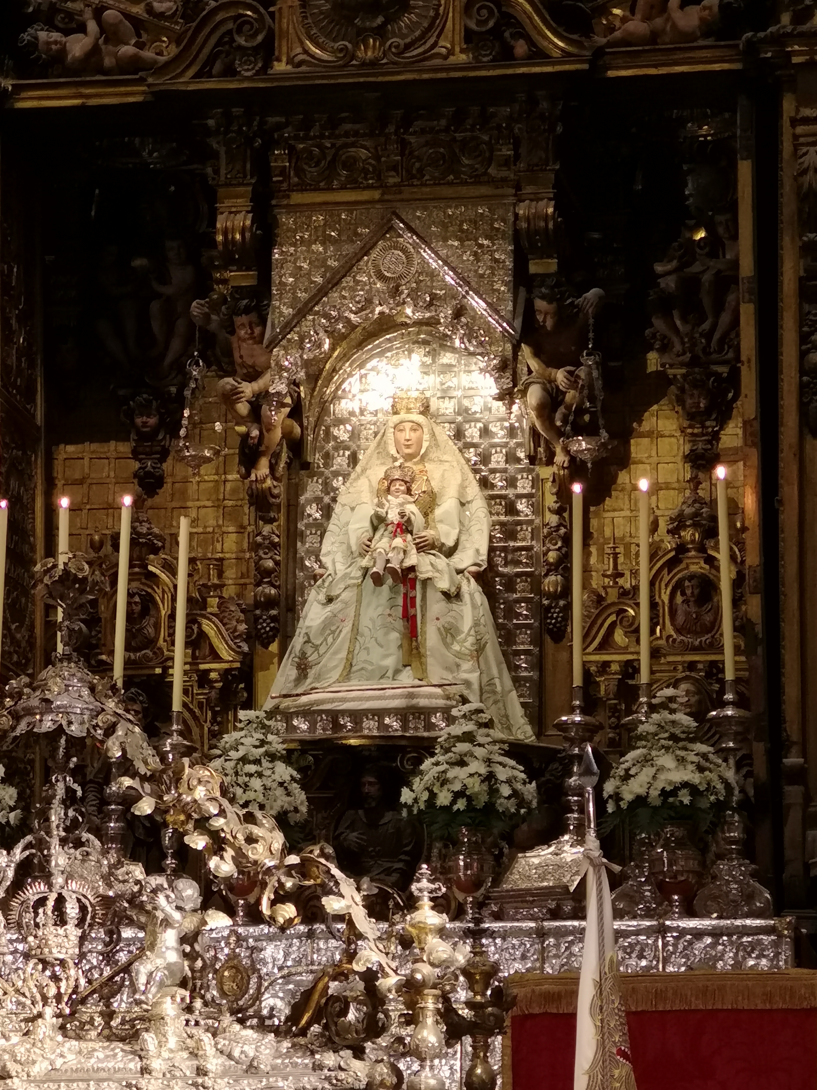 La imagen sedente de la Virgen que se instaló en la Capilla Real es una bellísima talla del gótico francés que, según la tradición, recibió don Fernando como obsequio de su primo el rey don Luis IX de Francia, también canonizado, y de siempre la dispensó una especial veneración hasta el punto de llevar en el borrén delantero de su silla de combate una reducida reproducción, talla en marfil, de esta imagen. Dicha copia se conserva en la cripta de la Capilla Real bajo la advocación de Nuestra Señora de las Batallas. Existían tres copias de esta talla: una se conservaba en la iglesia Colegial de san Salvador, con la advocación de la Virgen de las Aguas; otra estaba en el convento de san Clemente; y la tercera en el convento de san Francisco, en poder de la Cofradía de san Mateo. Las tres copias fueron obsequios ofrecidos por el propio rey Fernando[04].