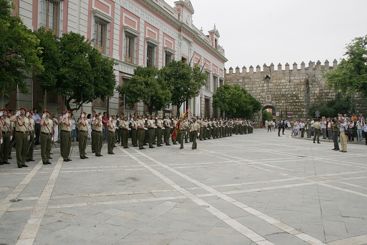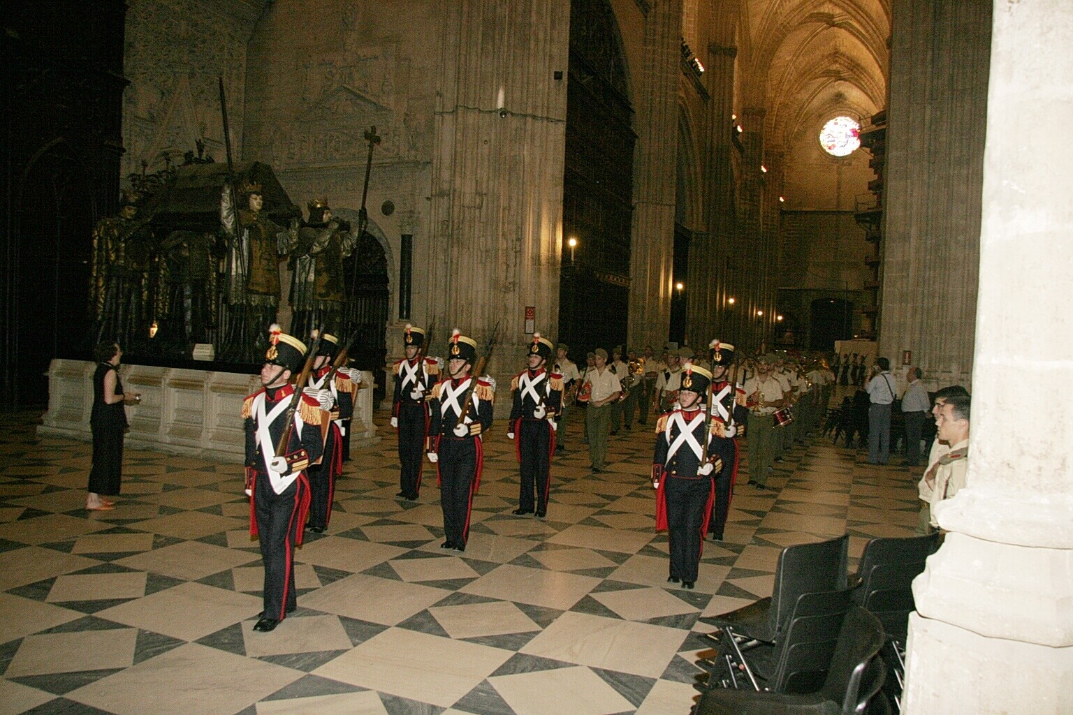 La ceremonia es posiblemente la única en su especie dentro del orbe cristiano. Una compañía con escuadra de gastadores, banda, música y Bandera, al mando de un capitán, entra en la catedral por la puerta de las Campanillas a tambor batiente en columna de a tres, a paso lento o con arma sobre el hombro a paso ordinario; recorre las naves del templo hasta que la Bandera se sitúa a la altura de la puerta de la Capilla Real. Tras ordenar “alto, descansen y derecha” a viva voz o con el cornetín de órdenes, la compañía queda formada en línea dando frente al altar de la capilla. Tras ordenar “presenten” se da entrada al Himno Nacional. Los acordes del himno llenan todo el templo, la bandera se desplaza lentamente hacia el altar, la cortinilla de la urna de cristal del santo rey Fernando se levanta lentamente descubriendo su cuerpo incorrupto. La escuadra de gastadores toma su posición en la capilla. La fuerza queda en esta posición hasta la hora de cerrar la cortinilla, momento en que se repite el ceremonial en sentido inverso, hasta que la compañía sale por la puerta de los Palos.