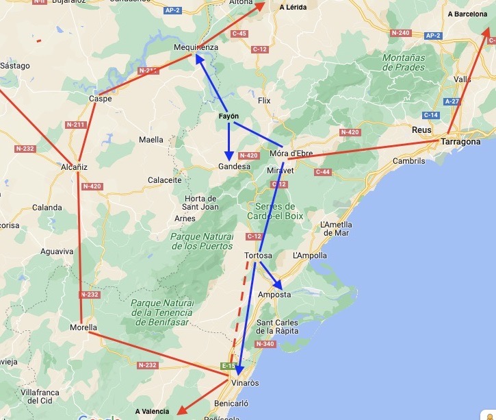 De esta manera, combinando las líneas de infraestructura civil permanente con las lineas de campaña de la linea del Ebro, las comunicaciones militares entre Madrid y Barcelona podían realizarse por cuatro vías diferentes. Las cuatro seguían el camino inicial Barcelona – Tarragona – Mora de Ebro. Aquí se bifurcaban tres caminos hacia Zaragoza-Madrid y uno hacia Valencia-Madrid: