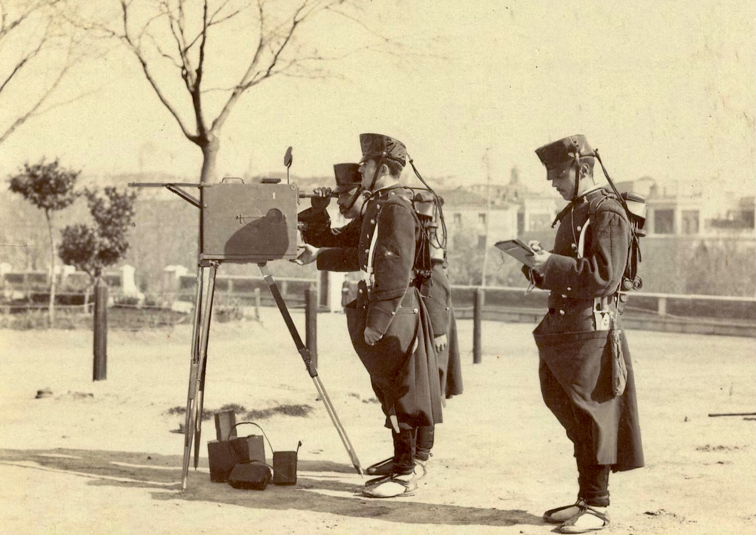 El comandante Cervera hizo sus primeras experiencias de “transmisión a distancia de la energía sin conductores” en el Batallón de Telégrafos, lo que le permitió certificar sus patentes[09], logrando enlazar desde el Cuartel de la Montaña con los cuarteles de Carabanchel y Leganés, éste último distante nueve kilómetros. El 6 de diciembre de 1899 realizó una demostración en la explanada del Cuartel de la Montaña[10] de Madrid delante de S.M. la Reina Regente María Cristina[11], un adolescente Alfonso XIII y diversas autoridades militares, entre las que se encontraban el ministro de la Guerra y el capitán general de Castilla la Nueva. El capitán Gallego Ramos, futuro coronel jefe del Regimiento de Telégrafos, se hizo eco de las experiencias del comandante Cervera en la revista “La energía eléctrica”. El interés por esta naciente tecnología no había hecho más que empezar; en 1900 el capitán de Ingenieros Isidro Calvo y Juana, profesor de la Academia de Ingenieros, publicó en Guadalajara el primer libro escrito en España sobre la telegrafía sin hilos.