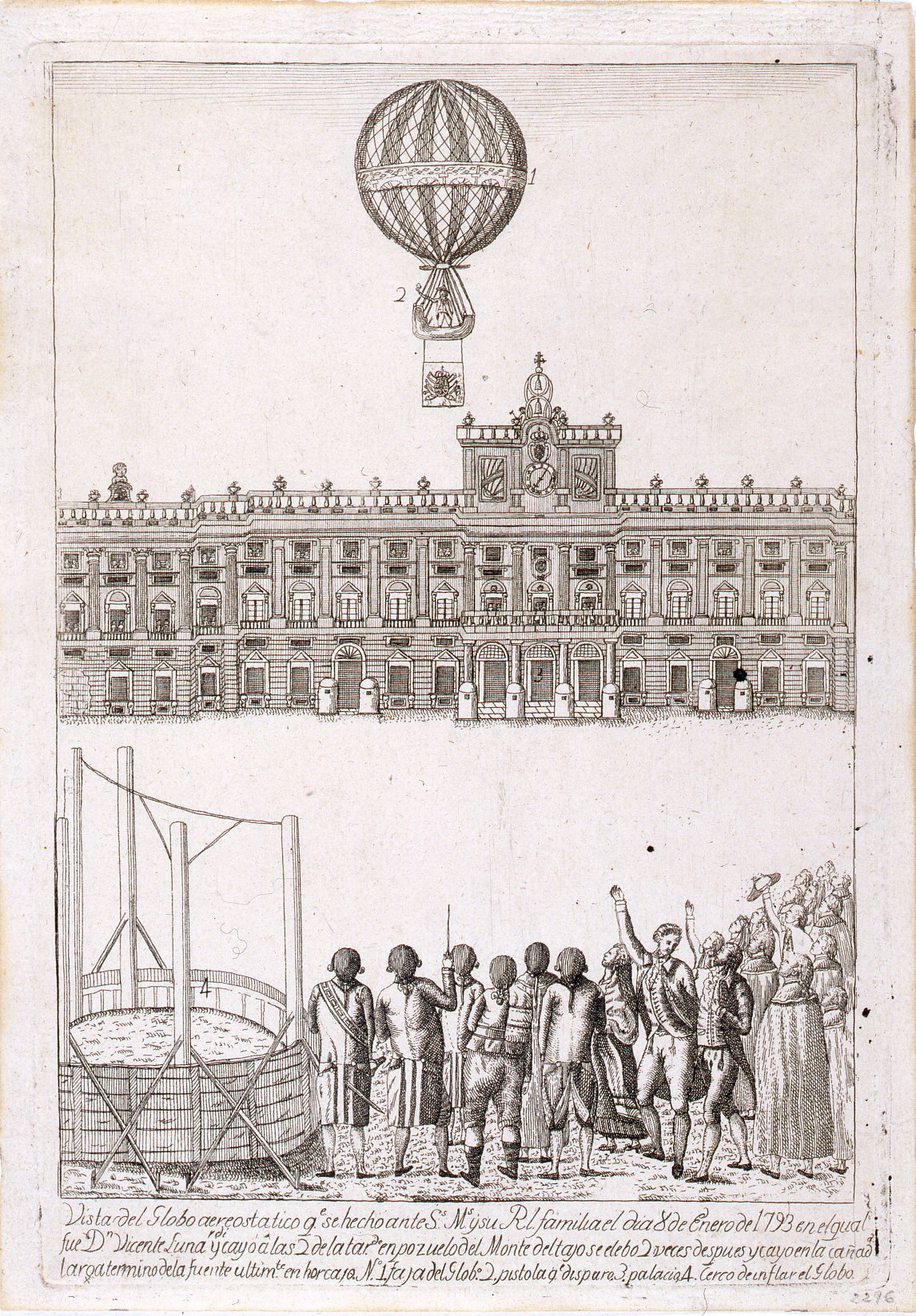 En España el incombustible ingeniero Agustín de Betancourt se elevó en un globo desde el Retiro en 1784; el capitán Vicente Lunardi[17] hizo lo propio desde la Plaza de Oriente de Madrid en 1792. El capitán Proust, profesor francés de química del Real Colegio de Artillería de Segovia, construyó un globo en el que consiguió elevarse junto con cadetes del colegio ante el rey Carlos IV en noviembre de 1792, al que siguió una segunda ascensión de Lunardi en enero de 1793 delante del rey y su familia. Estos éxitos llevaron al conde de Aranda a redactar un informe sobre las ventajas de los globos para la observación artillera. Desgraciadamente, el invento quedó en el olvido en España.