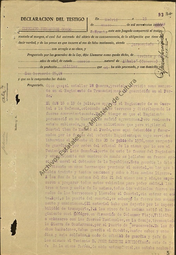 El día 18 ó 19 de julio, se aprestó el Regimiento de su Cuartel a la defensa, colocando sacos terreros y distribuyendo la fuerza convenientemente. En el tiempo en que el Regimiento permaneció en su Cuartel, no sufrió agresiones. Pero realmente estaba sublevado, ya que los milicianos que para vigilar el Cuartel iban de Madrid al Pardo, eran aquí detenidos y desarmados por la fuerza del referido Regimiento; en cuyo servicio intervino el dicente el dia 20 de julio de 1936, como sargento de guardia y por orden del oficial de la misma que lo era el Teniente D. Luis Guzmán. Aparte de esto la fuerza del Regimiento y especialmente sus cuadros de mando se hallaban en franca oposición moral al Gobierno de la República. Esta guardia la daba el dicente en unos barracones próximos al cuartel, en los que había treinta y tantos camiones y ocho o diez coches ligeros.