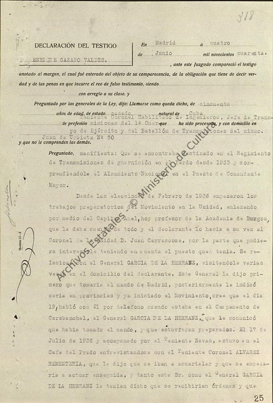 Desde las elecciones de Febrero de 1936 empezaron los trabajos preparatorios del Movimiento en la Unidad, enlazando por medio del Capitán Anel, hoy profesor de la Academia de Burgos, que le daba cuenta de todo y el declarante lo hacía a su vez al Coronel de la Unidad D. Juan Carrascosa, por la parte que pudiera interesarle teniendo en cuenta el puesto que tenía. Se relacionó con el General GARCÍA DE LA HERRANZ, visitándole varias veces en el domicilio del declarante. Este General le dijo primero que tomaría el mando de Madrid, posteriormente le indicó sería en provincias y ya iniciado el Movimiento, cree que el dia 19, habló con él por teléfono cuando estaba en el Campamento de Carabanchel, el General GARCÍA DE LA HERRANZ, que le comunicó que había tomado el mando, y que estuvieran preparados.