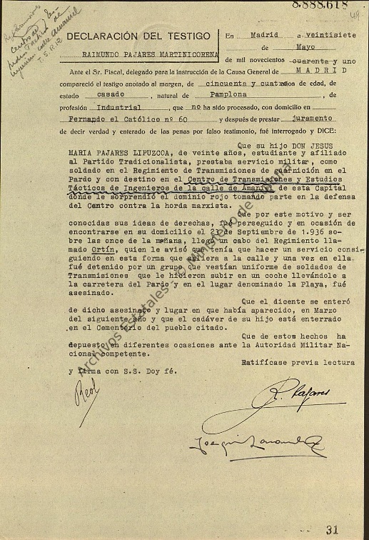 Que su hijo DON JESÚS MARÍA PAJARES LIPUZCOA, de veinte años, estudiante y afiliado al Partido Tradicionalista, prestaba servicio militar, como soldado en el Regimiento de Transmisiones de guarnición en el Pardo y con destino en el Centro de Transmisiones y Estudios Tácticos de Ingenieros de la calle Amaniel de esta Capital donde le sorprendió el dominio rojo tomando parte en la defensa del Centro contra la horda marxista.