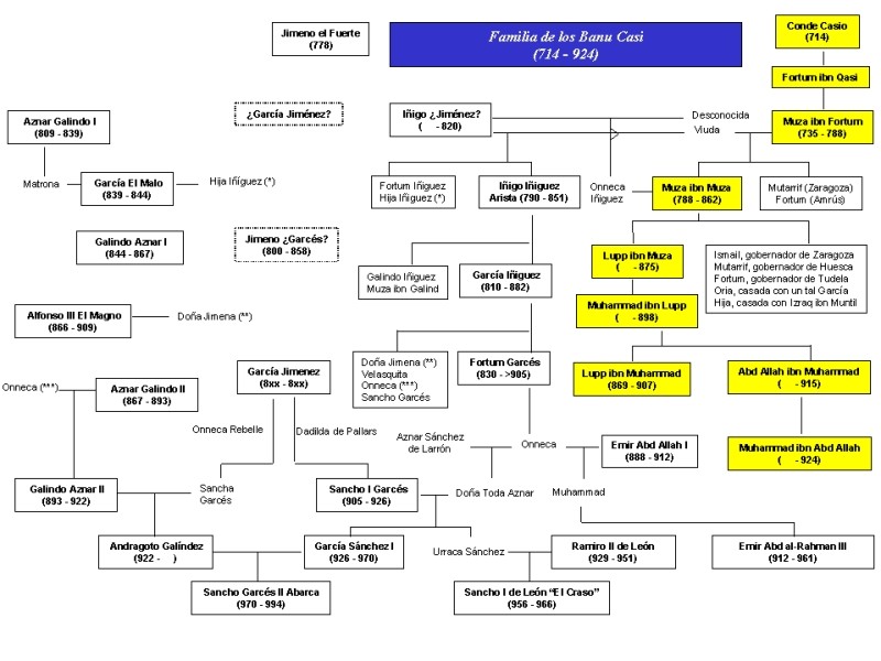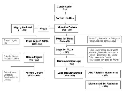 Conde Casio Fortum ibn Muza Muza ibn Fortum Mutarrif ibn Muza Fortum ibn Muza Muza ibn Muza Lupp ibn Muza Hijos de Muza ibn Muza Muhammad ibn Lupp Lupp ibn Muhammad Abd Allah ibn Muhammad Muhammad ibn Abd Allah Iñigo ¿Jiménez? Iñigo Iñiguez Arista García Iñiguez Fortum Garcés Hijos de Iñigo ¿Jiménez? Hijos de Iñigo Iñiguez Arista Hijos de García Iñiguez Jimeno el Fuerte (778) ¿García Jiménez? Jimeno ¿Garcés? (800-858) García Jiménez (8xx-8xx) Sancho I Garcés (905-926) García I Sánchez (926-970) Sancho II Garcés Abarca Doña Toda Aznar Aznar Galindo I (809-839) García El Malo (839-844) Galindo Aznar I (844-867) Aznar Galindo II (867-893) Galindo Aznar II (893-922) Andragoto Galíndez (922-9xx) Alfonso III El Magno (866-909) Ramiro II (929-951) Sancho I El Craso (956-966) Abd Allah (888-912) Abd al-Rahman III (912-961) Conde Casio Fortum ibn Muza Muza ibn Fortum Mutarrif ibn Muza Fortum ibn Muza Muza ibn Muza Lupp ibn Muza Hijos de Muza ibn Muza Muhammad ibn Lupp Lupp ibn Muhammad Abd Allah ibn Muhammad Muhammad ibn Abd Allah Iñigo ¿Jiménez? Iñigo Iñiguez Arista García Iñiguez Fortum Garcés Hijos de Iñigo ¿Jiménez? Hijos de Iñigo Iñiguez Arista Hijos de García Iñiguez
